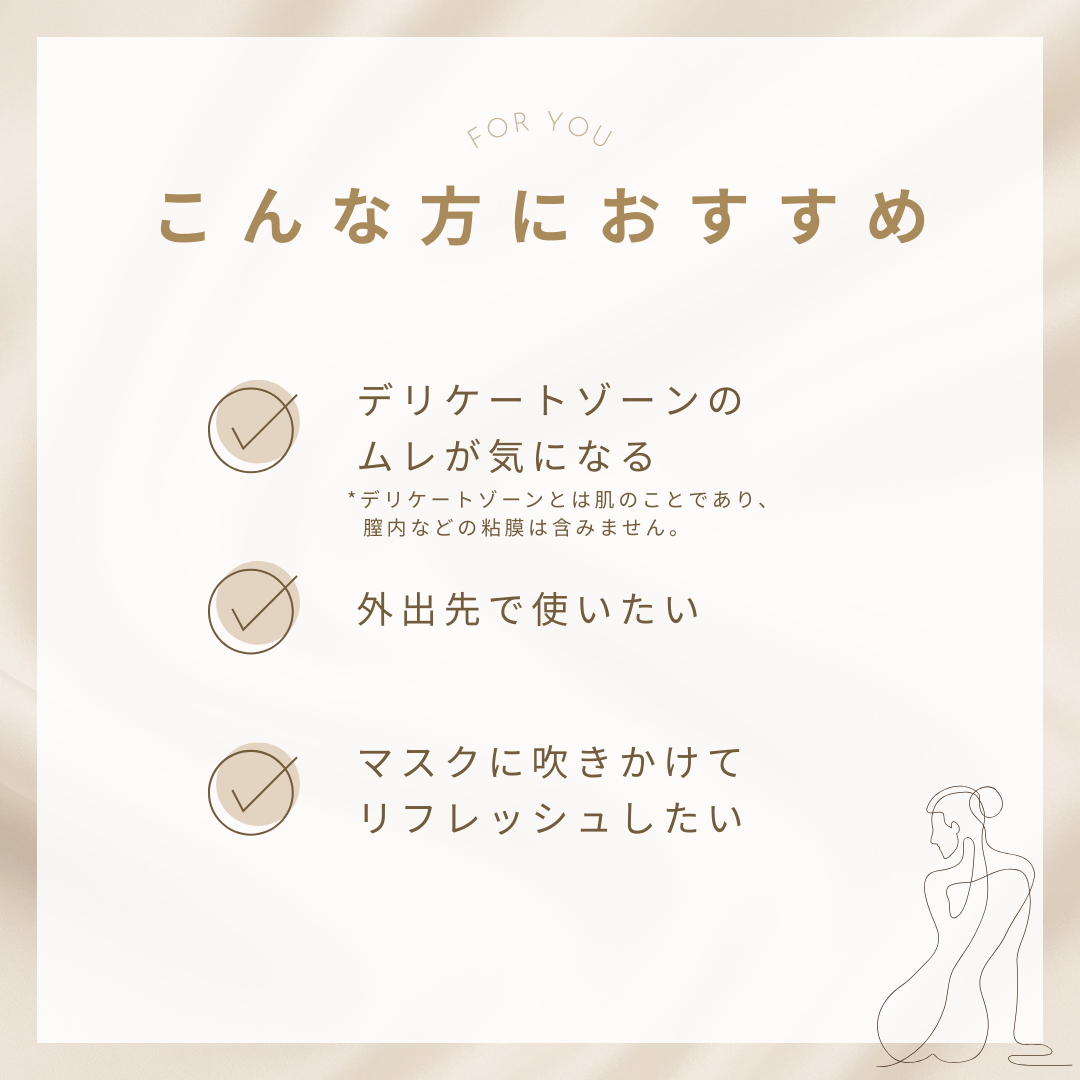 植物由来成分を使用したシンプルな配合で、ムレやニオイがこもりやすいデリケートゾーンの不快感をクリアに。保湿成分配合でリフレッシュと同時に肌にうるおいを与えます。