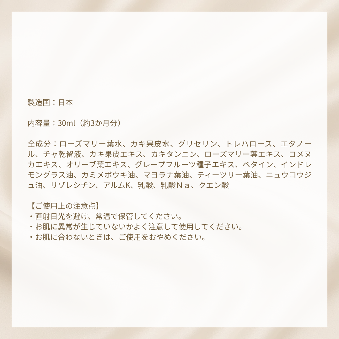 全成分:ローズマリー葉水、カキ果皮水、グリセリン、トレハロース、エタノール、チャ乾留液、カキ果皮エキス、カキタンニン、ローズマリー葉エキス、コメヌカエキス、オリーブ葉エキス、グレープフルーツ種子エキス、ベタイン、インドレモングラス油、カミメボウキ油、マヨラナ葉油、ティーツリー葉油、ニュウコウジュ油、リゾレシチン、アルムK、乳酸、乳酸Na、クエン酸