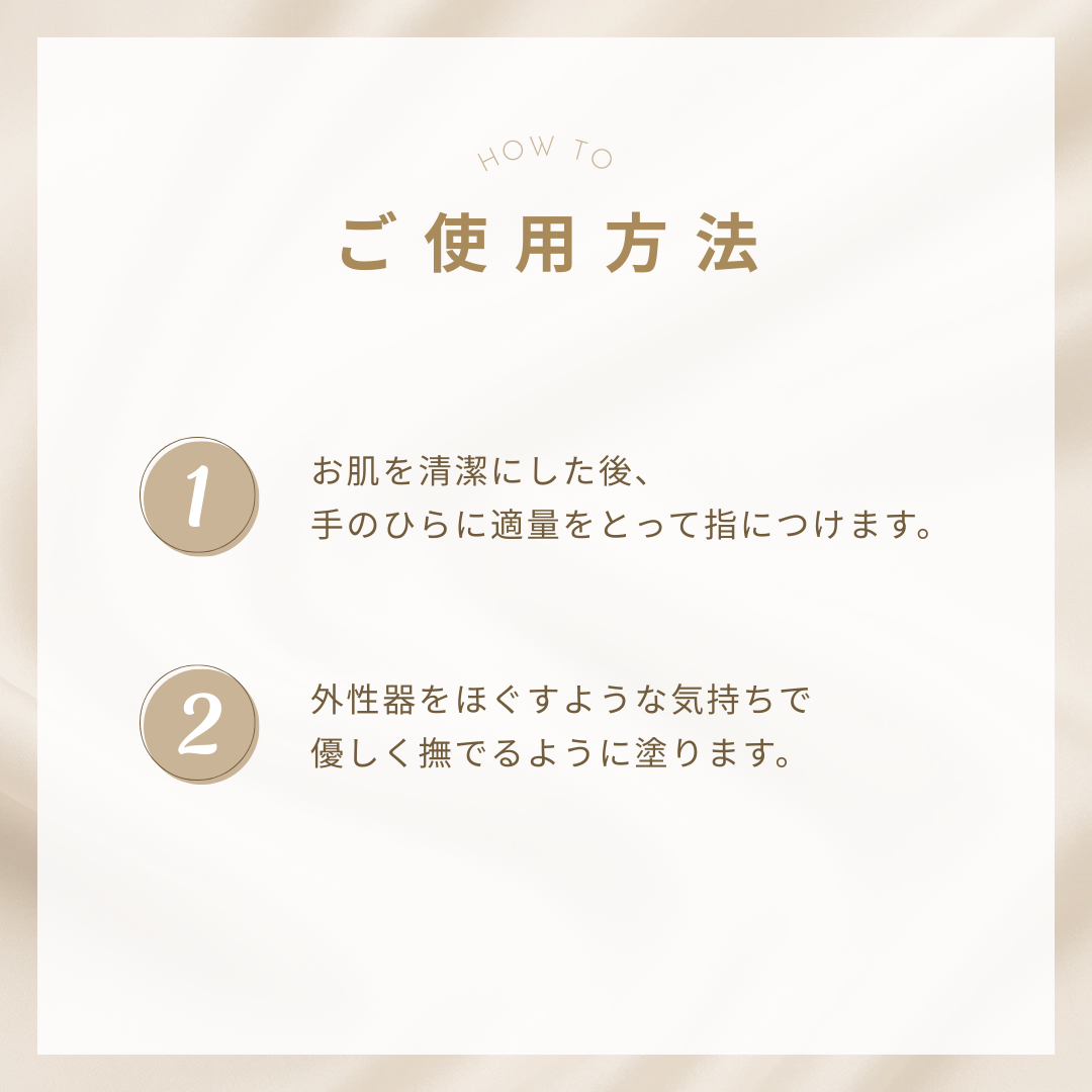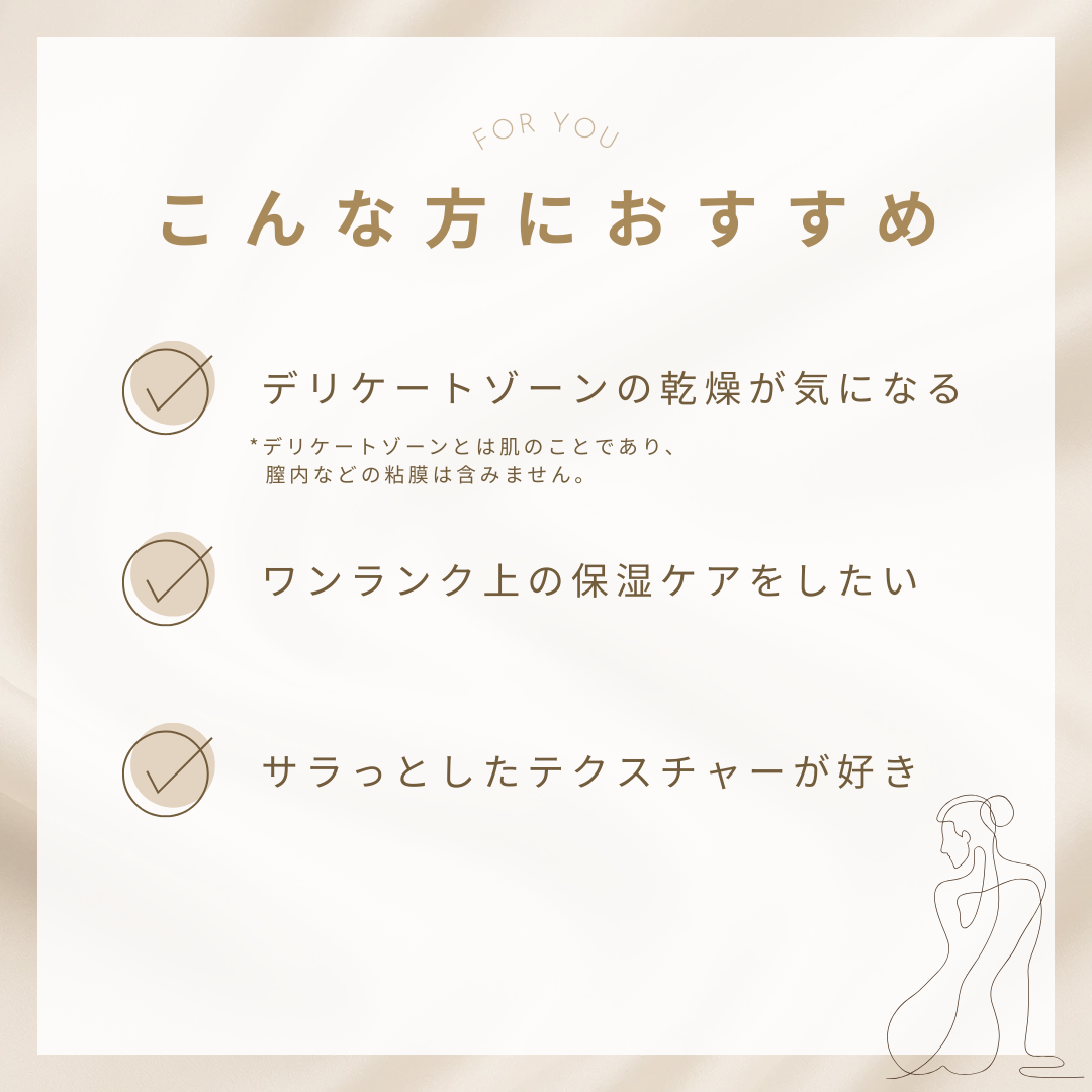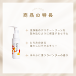 洗浄後のデリケートゾーンを包み込むように保湿するセラム。とろみのある瑞々しいテクスチャーで、伸びがよくデリケートゾーン全体に広がります。ほのかに漂うラベンダーの⾹りが⼼を癒します。