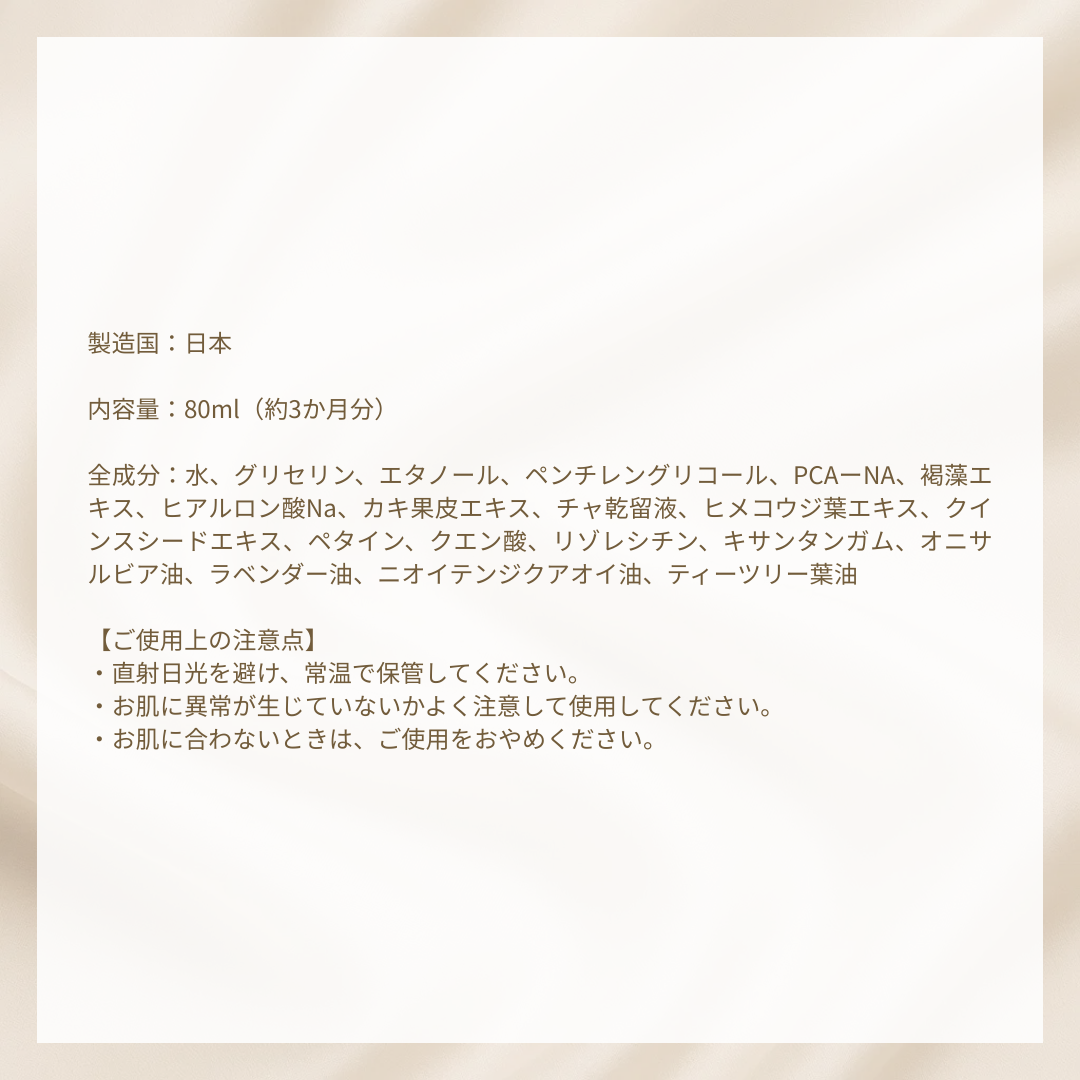 水、グリセリン、エタノール、ペンチレングリコール、PCAーNA、褐藻エキス、ヒアルロン酸Na、カキ果皮エキス、チャ乾留液、ヒメコウジ葉エキス、クインスシードエキス、ペタイン、クエン酸、リゾレシチン、キサンタンガム、オニサルビア油、ラベンダー油、ニオイテンジクアオイ油、ティーツリー葉油