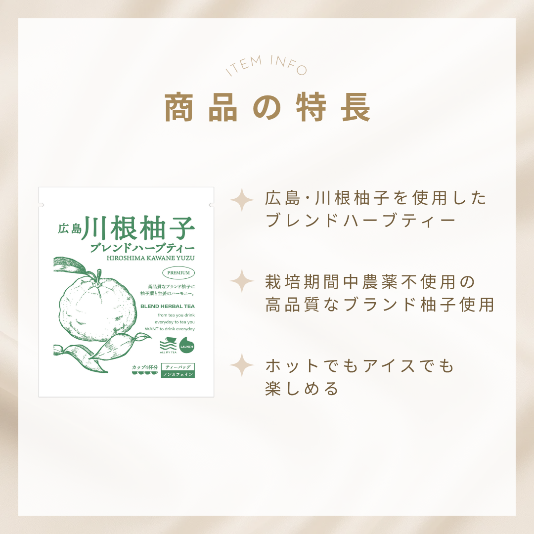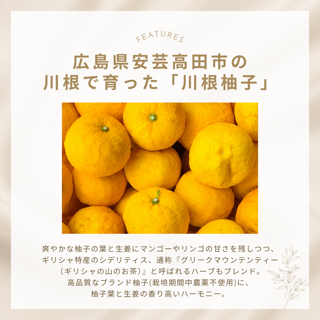 広島県安芸高田市の川根で育った「川根柚子」を相性の良いシデリティス「(通称)グリークマウンテンティー」とブレンドする事で川根柚子が持つ独特の香りが際立つハーブティーに仕上がりました。シデリティスには冷え・浮腫み・リラックス効果(不眠)に良いとされています。