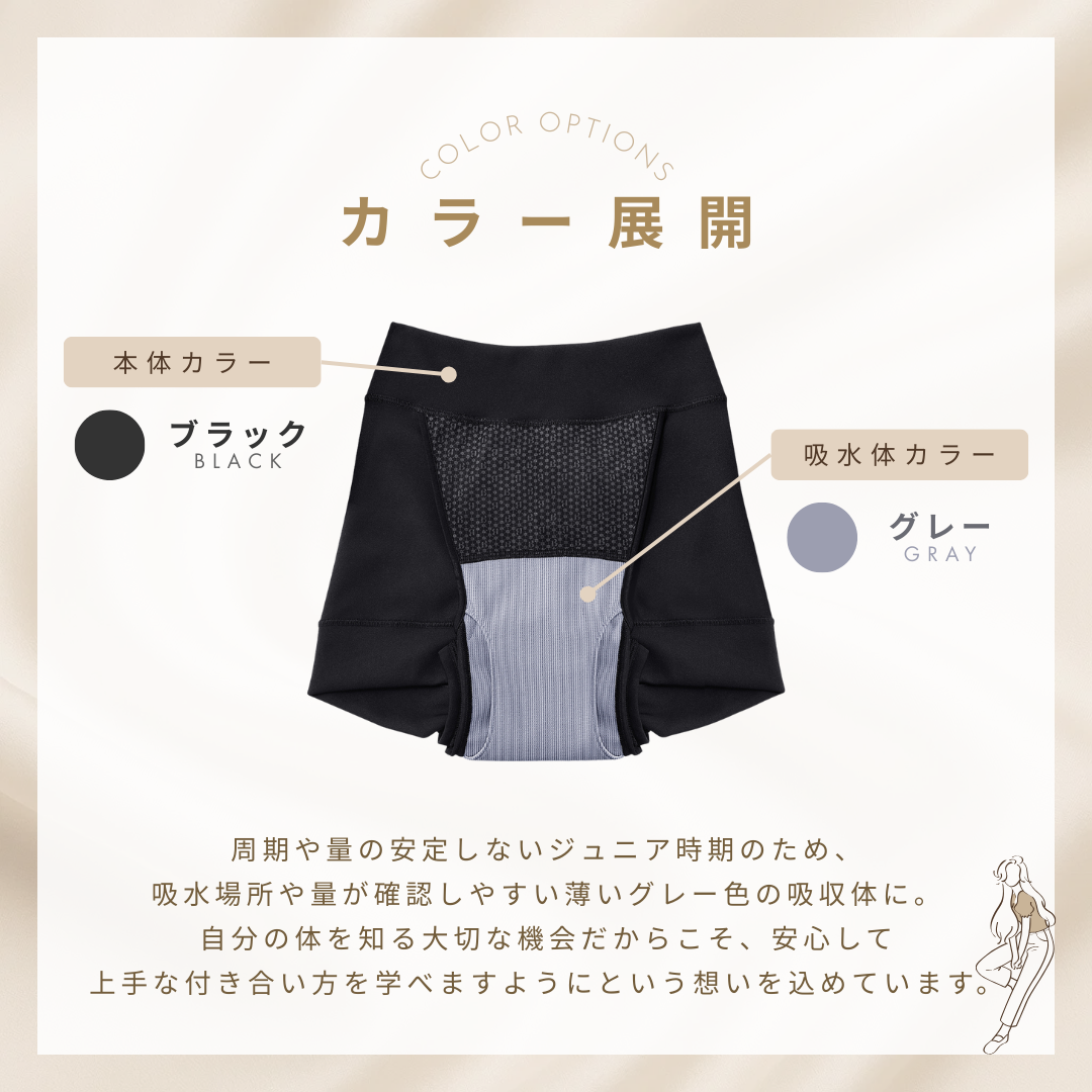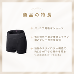 大好評の超吸収型サニタリーショーツ「ベア シグネチャー ショーツ」のジュニアライン。周期や量の安定しないジュニア時期のため、吸水場所や量が確認しやすい薄いグレー色の吸収体に。独自のテクノロジー構造で、約125ml*1もの液体を吸水。