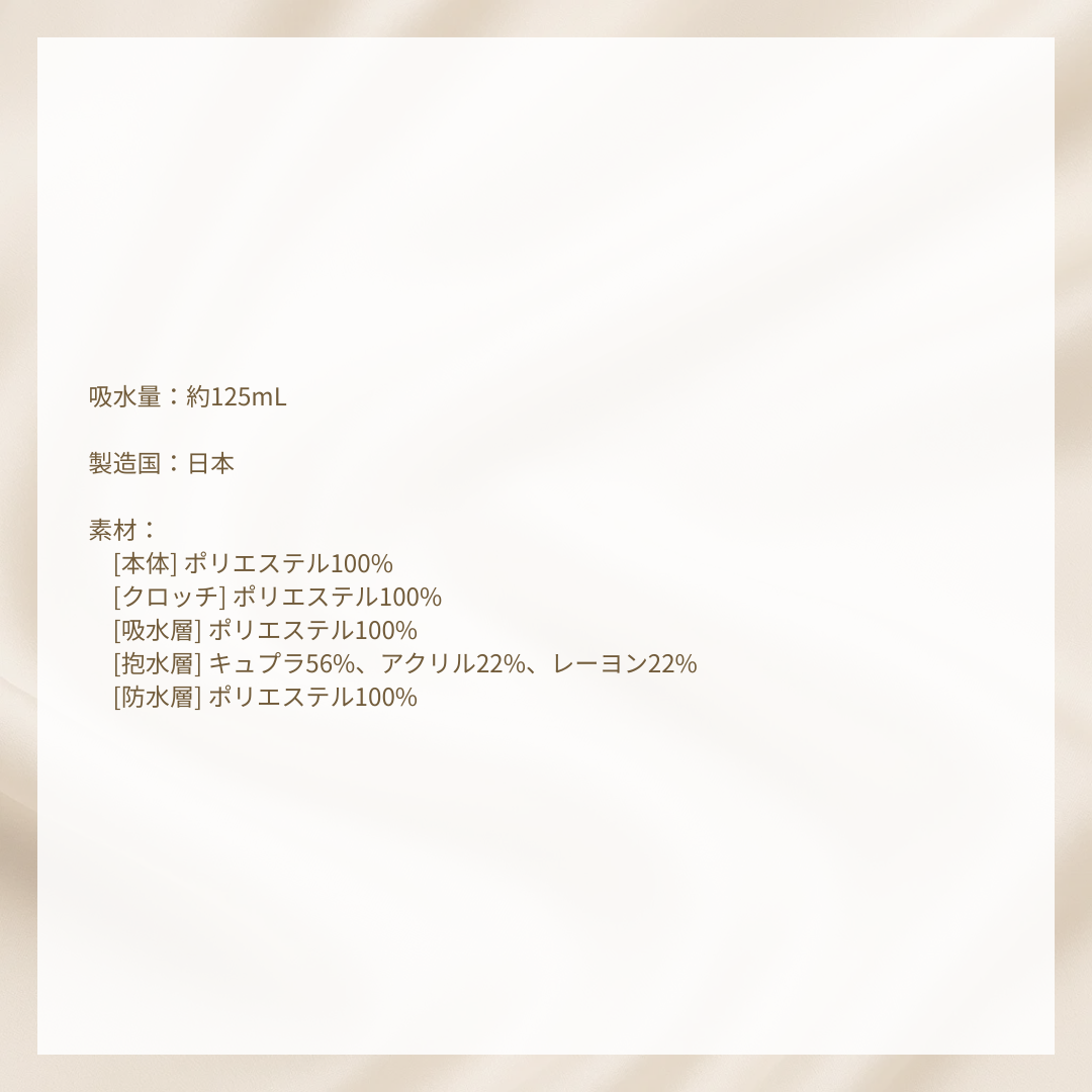 新しい生地は液体を弾きやすいため、漏れを防ぐためにもご使用前に一度洗濯機での予洗いをしてください。少量の洗剤でショーツ単体を洗い乾燥ののちお使いいただけます。 使い心地に慣れていただくためにも、最初はご自宅にいる時間が長い日や量の少ない日から徐々にお試しください。