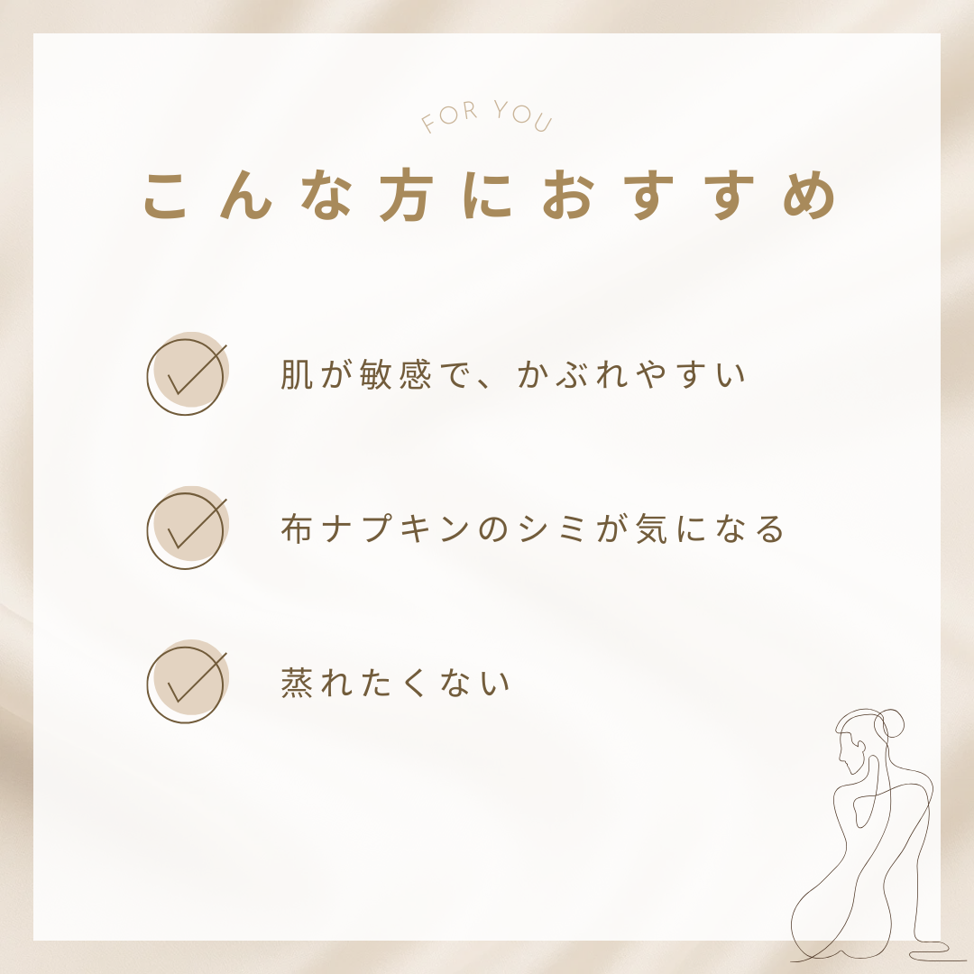 黒色の生地だから、乾かす間もシミが目に触れる心配がなく、快適な肌ざわりにより、身も心もストレスを感じないサニタリー体験を。