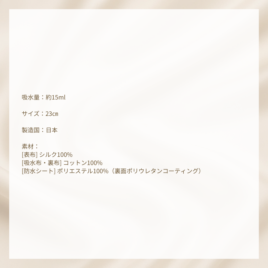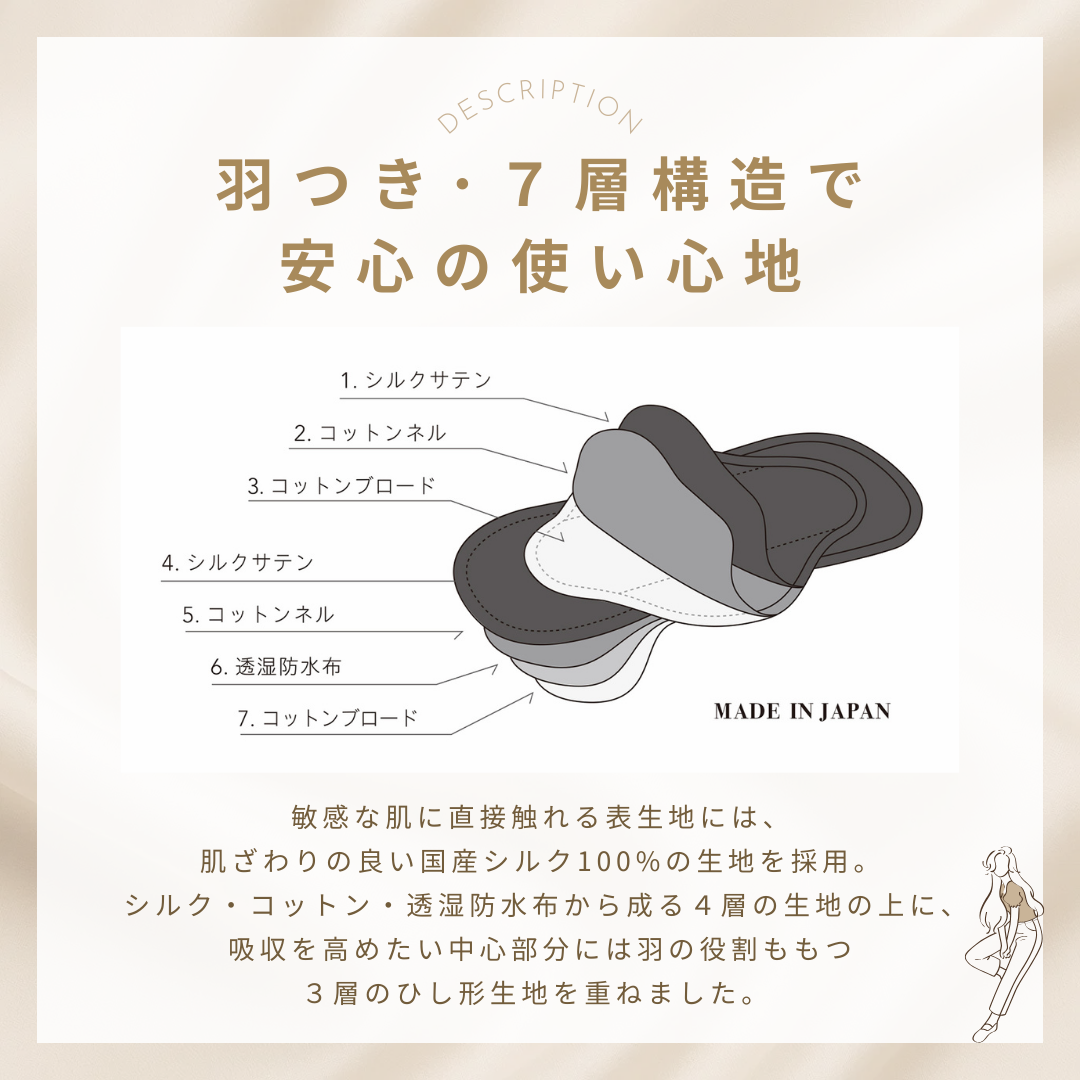 漏れやかぶれの悩みをターゲットにした、安心の7層構造で、肌に直接触れる部分はシルク100%のサテン生地。