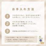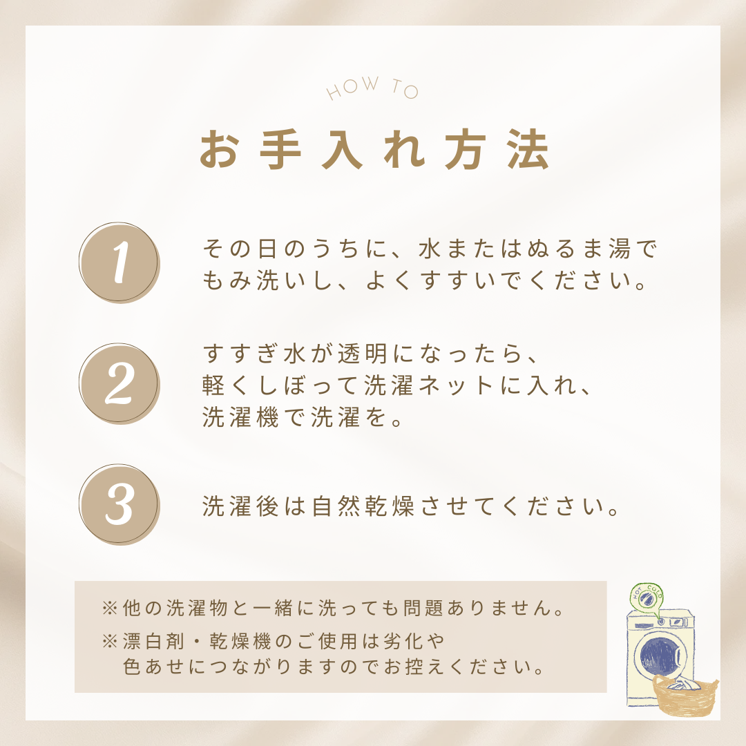 その日のうちに、水またはぬるま湯でもみ洗いし、よくすすいでください。 すすぎ水が透明になったら、軽くしぼって洗濯ネットに入れ、洗濯機で洗濯を。 他の洗濯物と一緒に洗っても問題ありません。漂白剤・乾燥機のご使用は劣化や色あせにつながりますのでお控えください。 洗濯後は自然乾燥させてください。