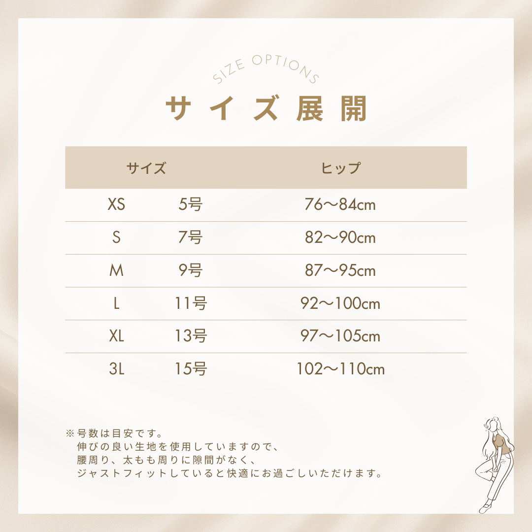 ※号数は目安です。伸びの良い生地を使用していますので、腰周り、太もも周りに隙間がなく、ジャストフィットしていると快適にお過ごしいただけます。