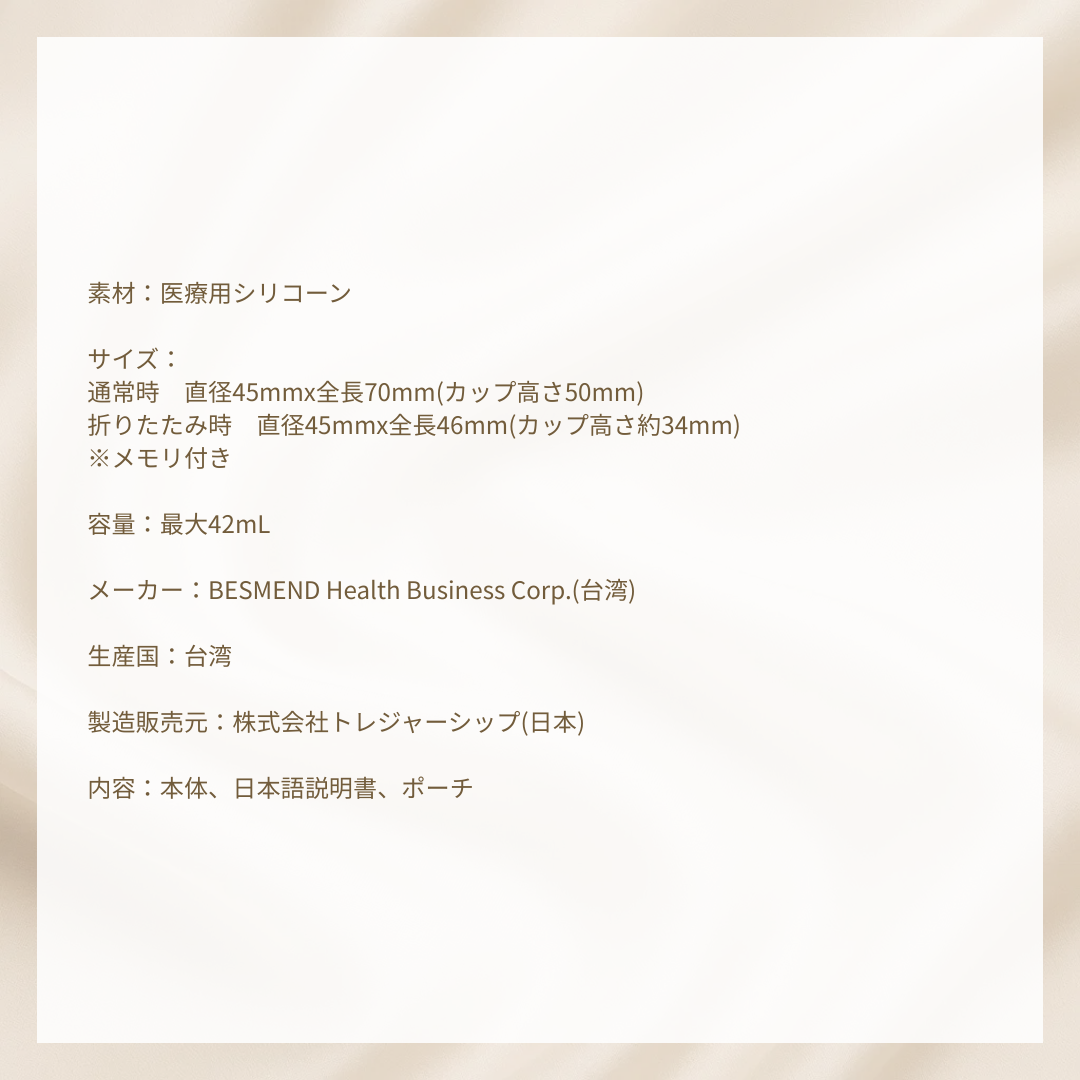 (2)柔らかさ:堅すぎず、柔らかすぎない触り心地で、スムースに装着できます。適度に張りのある硬さで、中でカップがしっかり開く安心のデザイン。これまで、月経カップがうまく開かず上手に使えなかった方にもおすすめです。柔らかく肌に心地よい医療用レベルのシリコン100%で作られています