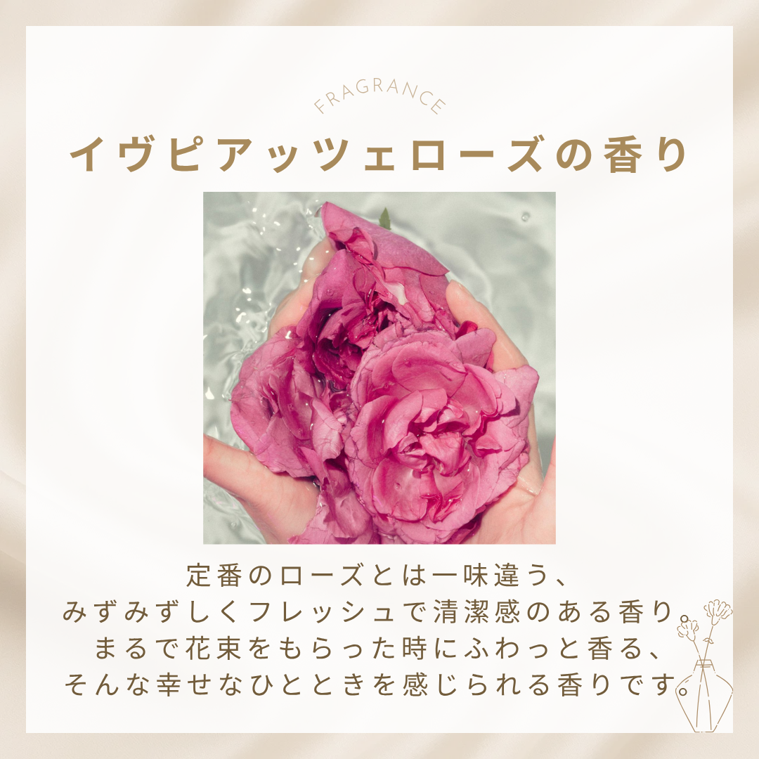 香りは、イヴピアッツェローズの香り。みずみずしくフレッシュで清潔感のある香り。まるで花束をもらった時にふんわり香る、そんな幸せなひとときを感じられる香り。