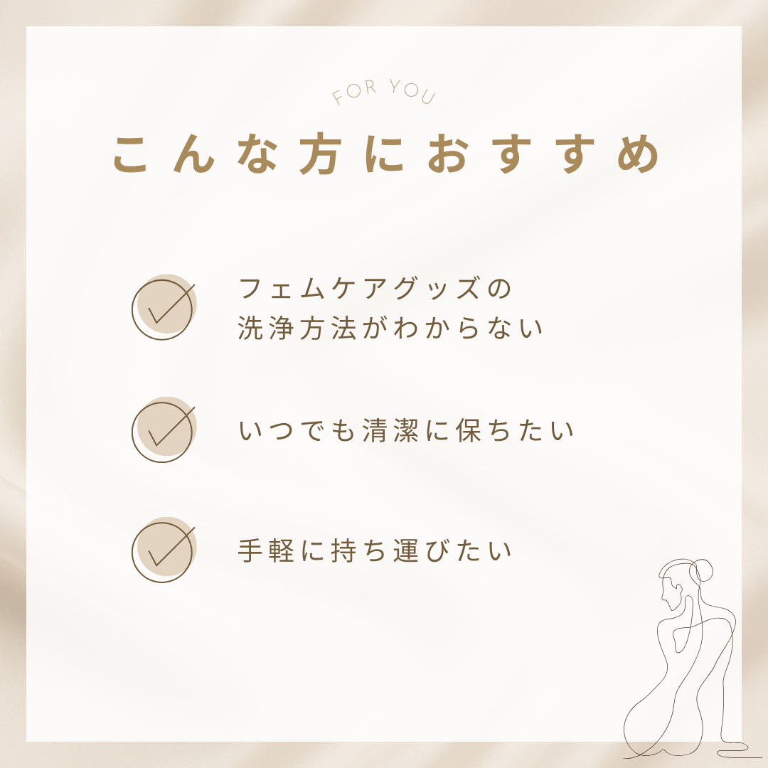 腟のpHバランスに合わせて作られています。月経カップやプレジャートイ、ちつトレグッズなどフェムケアグッズの使用前後の洗浄のためにつくられた、専用クリーナーです。