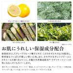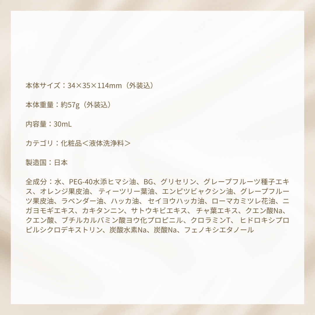 全成分:水、PEG-40水添ヒマシ油、BG、グリセリン、グレープフルーツ種子エキス、オレンジ果皮油、 ティーツリー葉油、エンピツビャクシン油、グレープフルーツ果皮油、ラベンダー油、ハッカ油、 セイヨウハッカ油、ローマカミツレ花油、ニガヨモギエキス、カキタンニン、サトウキビエキス、 チャ葉エキス、クエン酸Na、クエン酸、ブチルカルバミン酸ヨウ化プロピニル、クロラミンT、 ヒドロキシプロピルシクロデキストリン、炭酸水素Na、炭酸Na、フェノキシエタノール