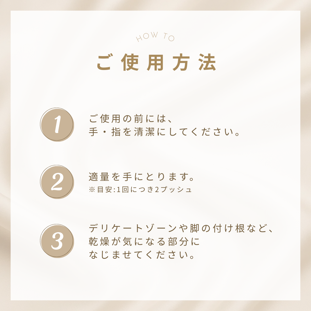 3:デリケートゾーンや脚の付け根など、乾燥が気になる部分になじませてください