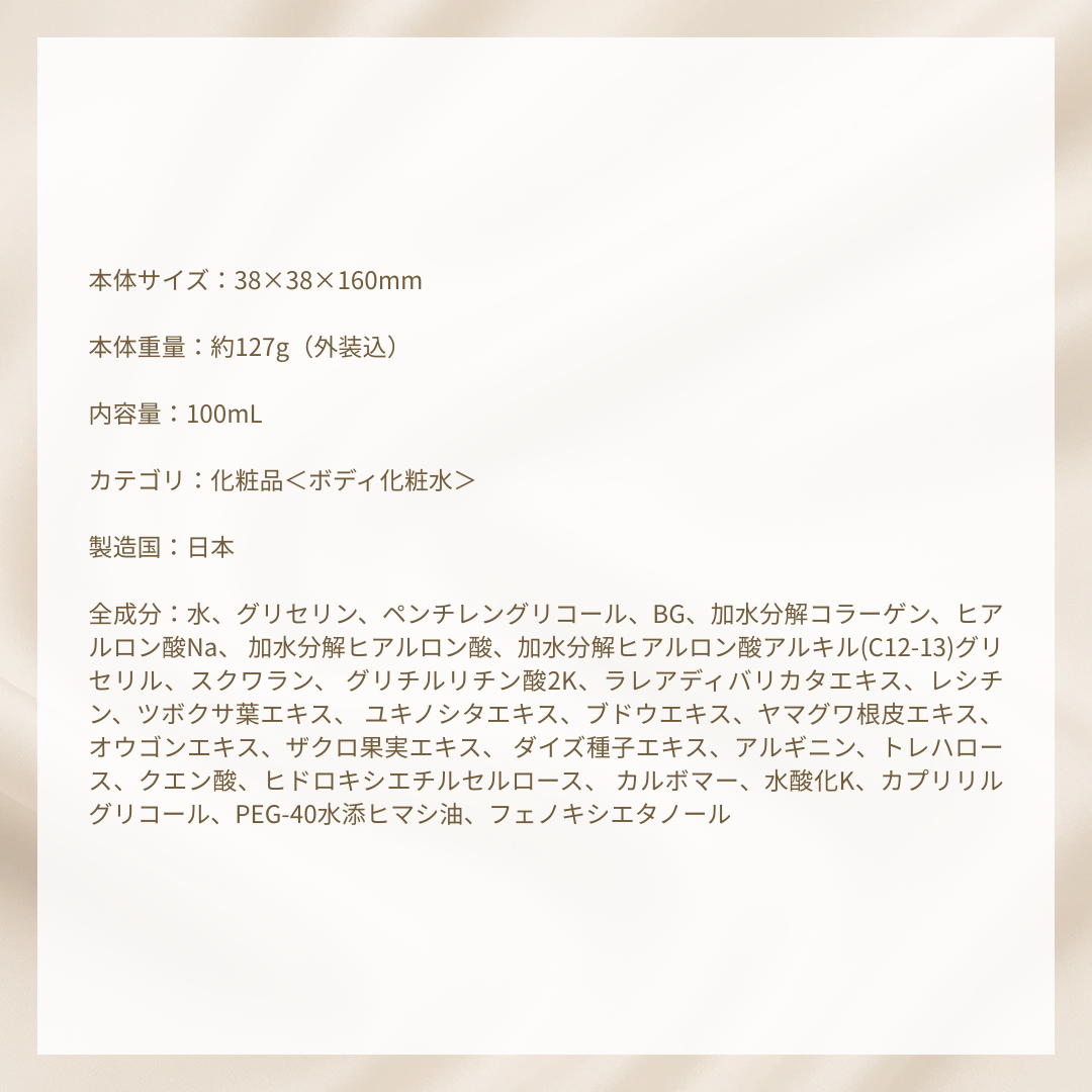 全成分:水、グリセリン、ペンチレングリコール、BG、加水分解コラーゲン、ヒアルロン酸Na、 加水分解ヒアルロン酸、加水分解ヒアルロン酸アルキル(C12-13)グリセリル、スクワラン、 グリチルリチン酸2K、ラレアディバリカタエキス、レシチン、ツボクサ葉エキス、 ユキノシタエキス、ブドウエキス、ヤマグワ根皮エキス、オウゴンエキス、ザクロ果実エキス、 ダイズ種子エキス、アルギニン、トレハロース、クエン酸、ヒドロキシエチルセルロース、 カルボマー、水酸化K、カプリリルグリコール、PEG-40水添ヒマシ油、フェノキシエタノール