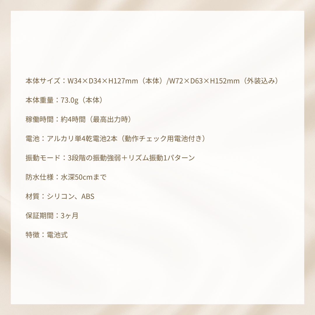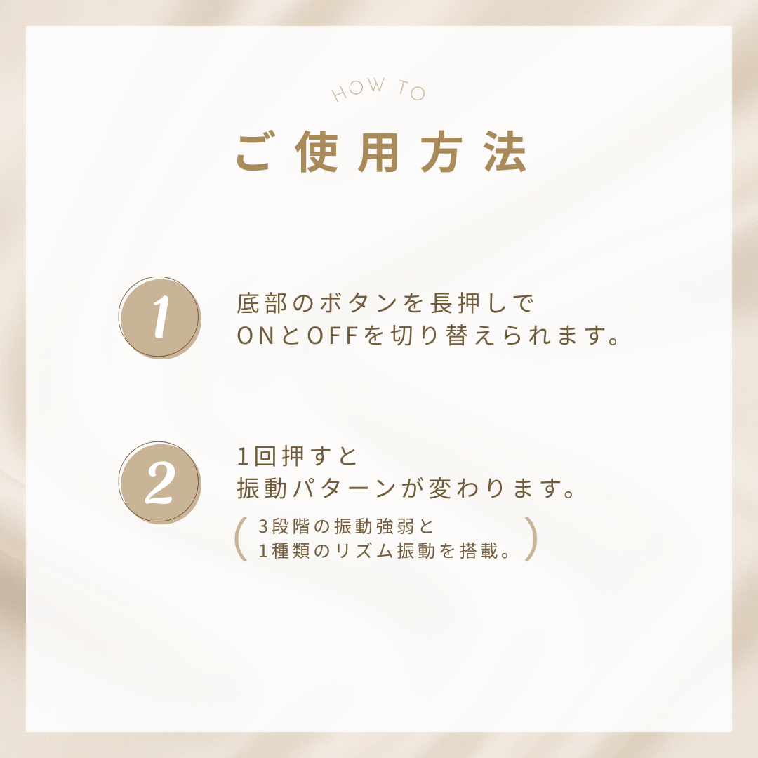 ・底部のボタンを長押しでONとOFFを切り替えられます。1回押すと振動パターンが変わります。(3段階の振動強弱と1種類のリズム振動を搭載。)