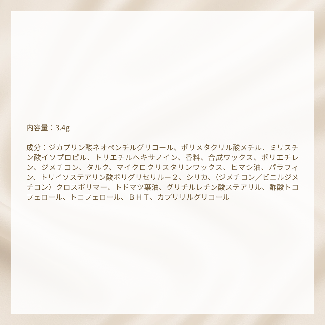 ジカプリン酸ネオペンチルグリコール、ポリメタクリル酸メチル、ミリスチン酸イソプロピル、トリエチルヘキサノイン、香料、合成ワックス、ポリエチレン、ジメチコン、タルク、マイクロクリスタリンワックス、ヒマシ油、パラフィン、トリイソステアリン酸ポリグリセリル-2、シリカ、(ジメチコン/ビニルジメチコン)クロスポリマー、トドマツ葉油、グリチルレチン酸ステアリル、酢酸トコフェロール、トコフェロール、BHT、カプリリルグリコール