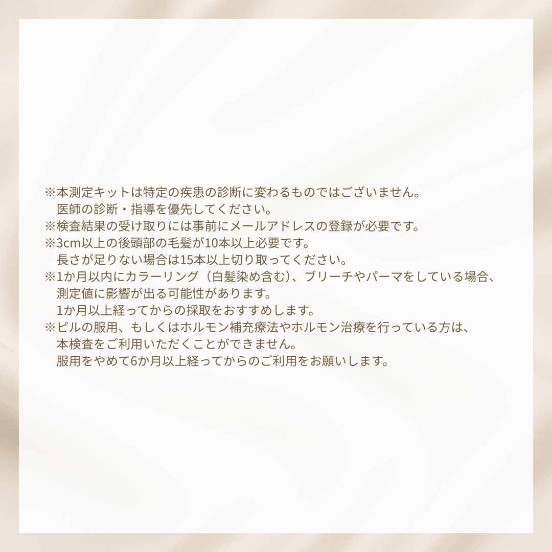 ※1か月以内にカラーリング(白髪染め含む)、ブリーチやパーマをしている場合、測定値に影響が出る可能性があります。1か月以上経ってからの採取をおすすめします。