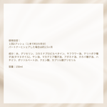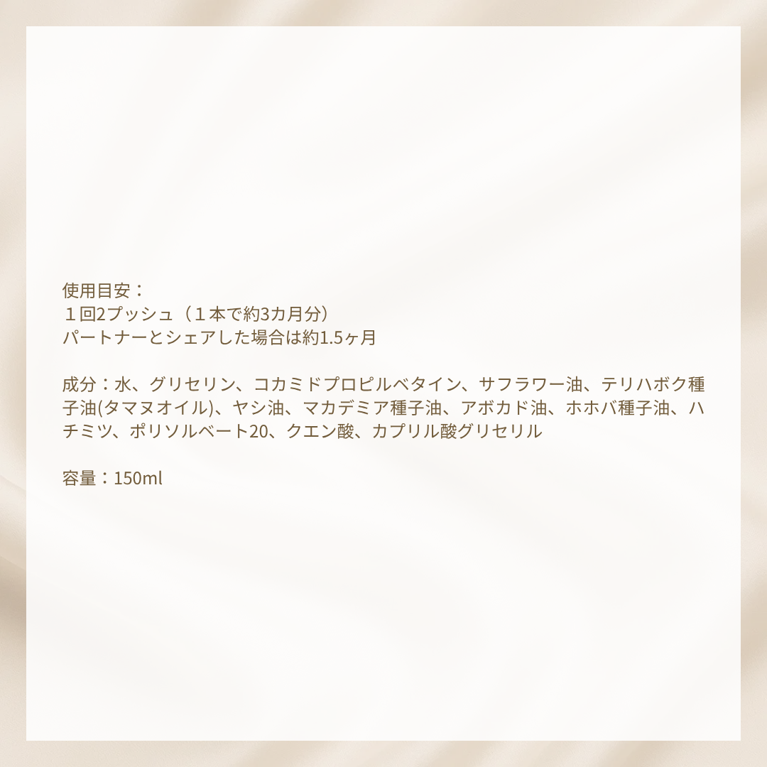 水、グリセリン、コカミドプロピルベタイン、サフラワー油、テリハボク種子油(タマヌオイル)、ヤシ油、マカデミア種子油、アボカド油、ホホバ種子油、ハチミツ、ポリソルベート20、クエン酸、カプリル酸グリセリル