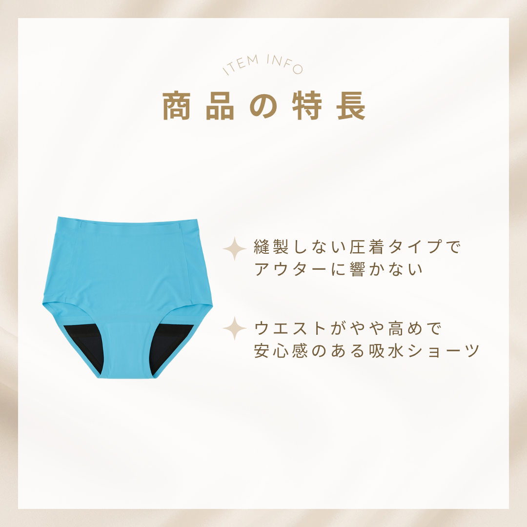 縫製しない圧着タイプでアウターに響かず着用することができ、ウエストをやや高めにしている安心感のあるショーツ。