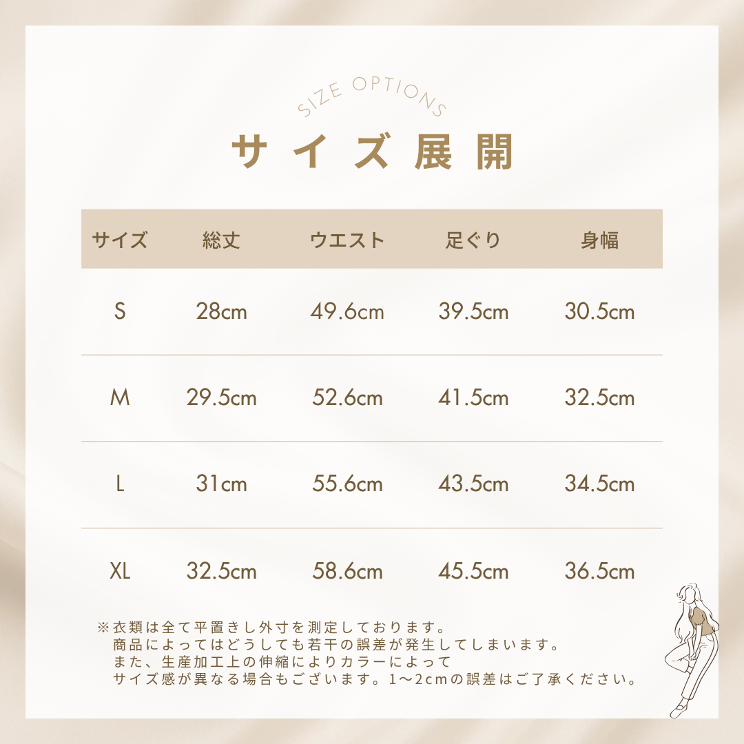 商品によってはどうしても若干の誤差が発生してしまいます。また、生産加工上の伸縮によりカラーによってサイズ感が異なる場合もございます。1〜2cmの誤差はご了承ください。