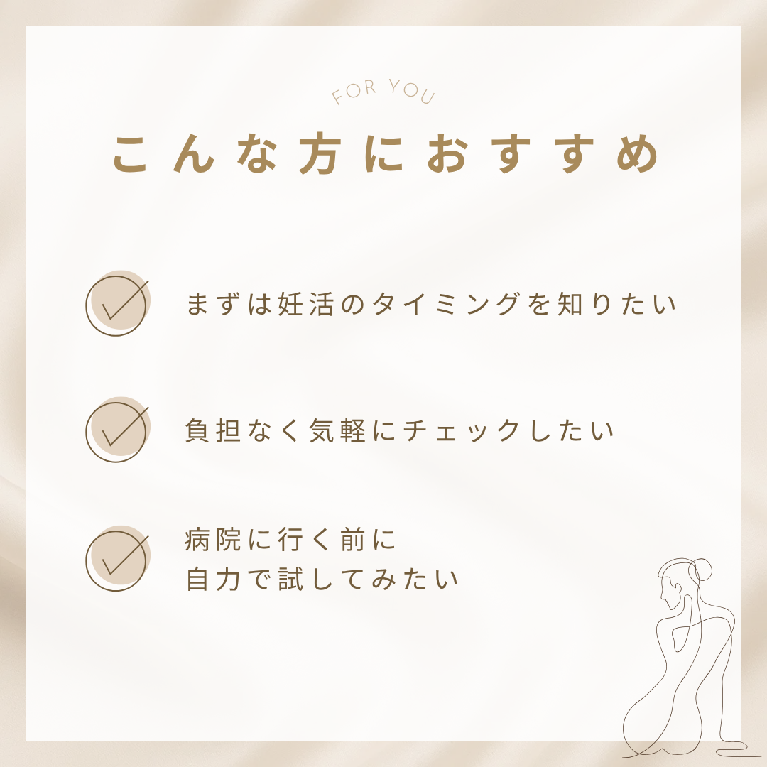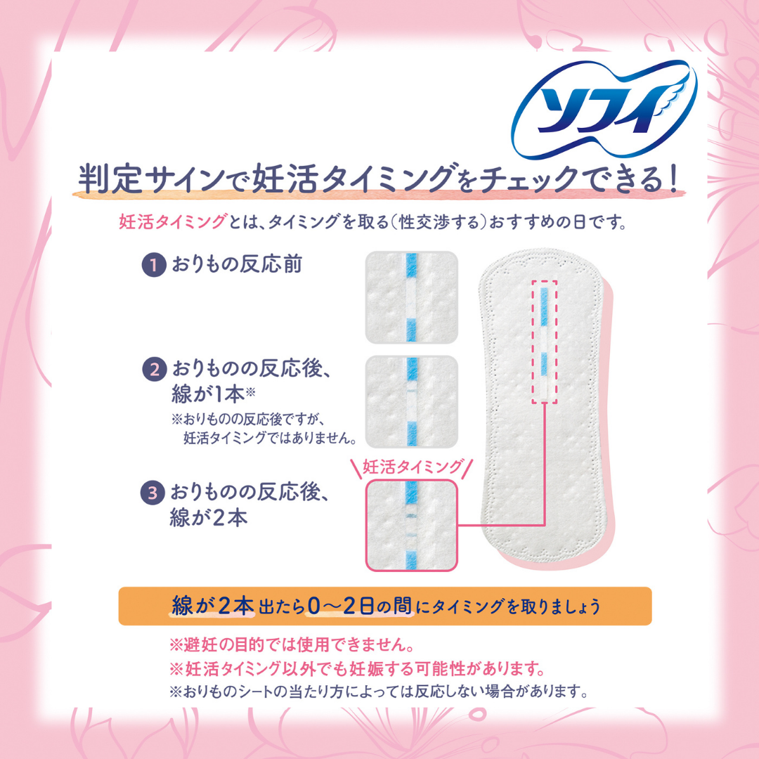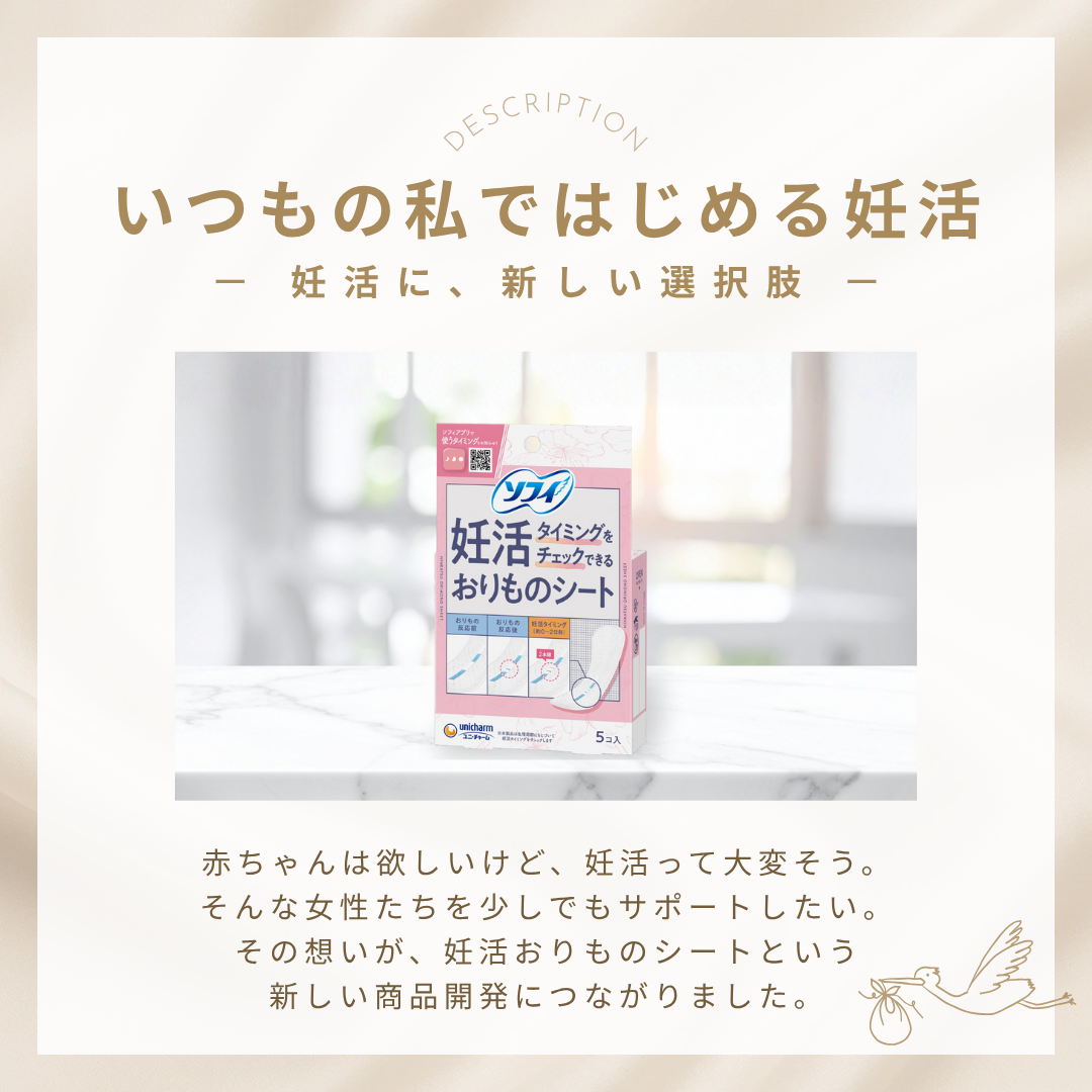 いつもの私ではじめる妊活 -妊活に、新しい選択肢-妊活タイミングをチェックできるおりものシートって?ショーツにつけて普段通りにお過ごしいただくだけで、おりものに反応し、妊活タイミングをお知らせする、全く新しいタイプのおりものシートです。妊活タイミングとは、妊娠の可能性が高いタイミングで性交渉をするオススメの日です。2本線が出たら約0-2日以内に性交渉のタイミングをとると妊娠の可能性を高める期待が持てます。
