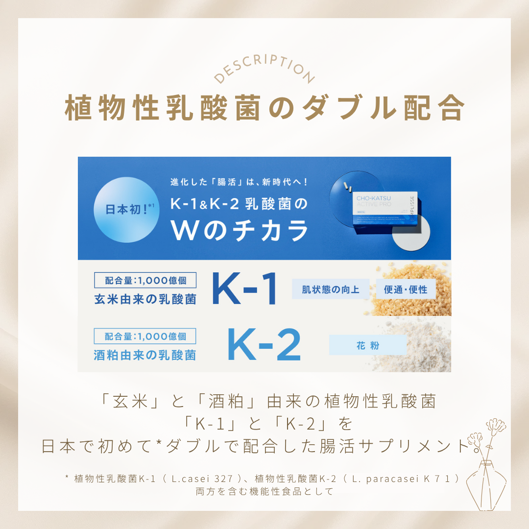 植物性乳酸菌K-1(L. casei 327):1,000億個、植物性乳酸菌K-2(L. paracasei K71):1,000億個