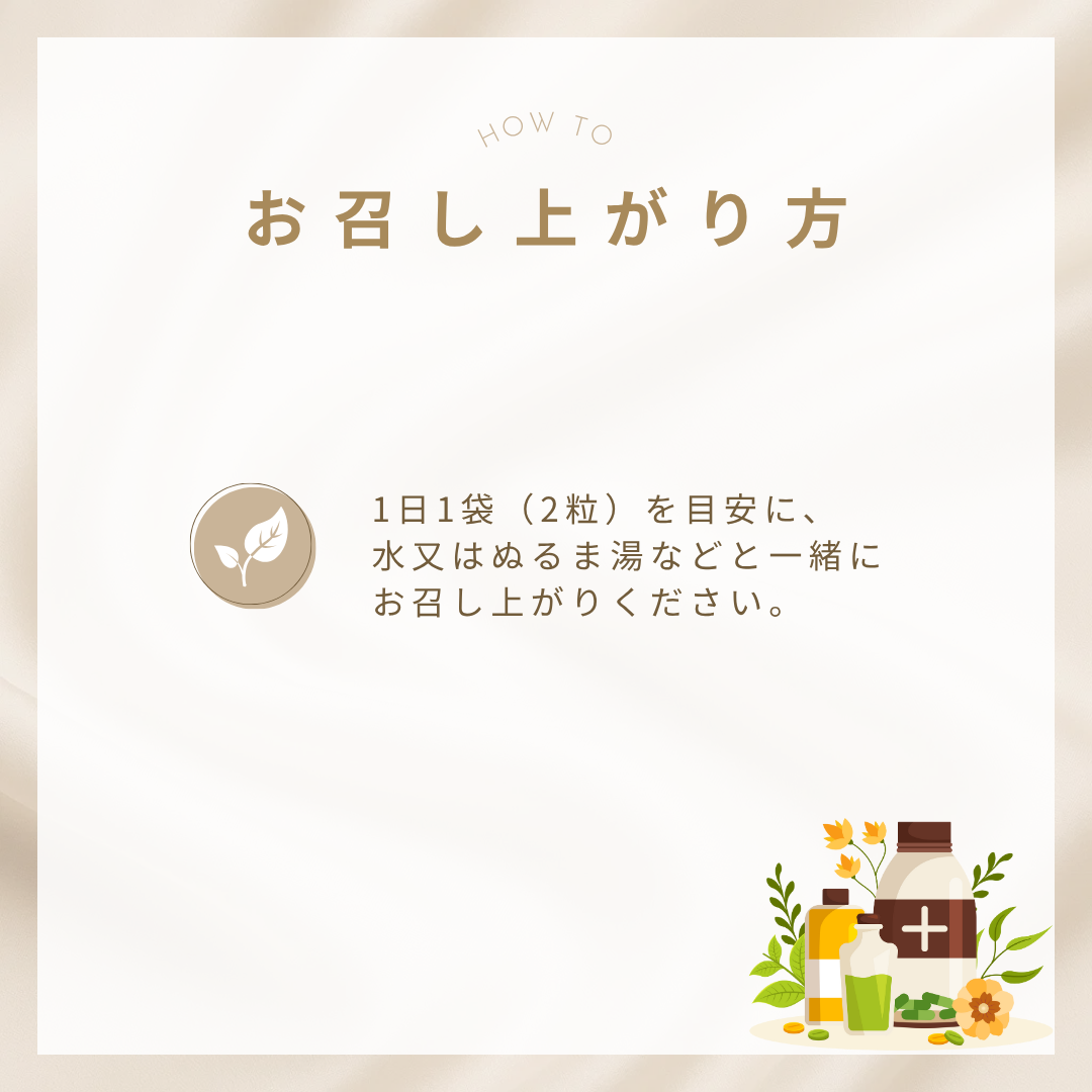 1日1袋(2粒)を目安に、水又はぬるま湯などと一緒にお召し上がりください。