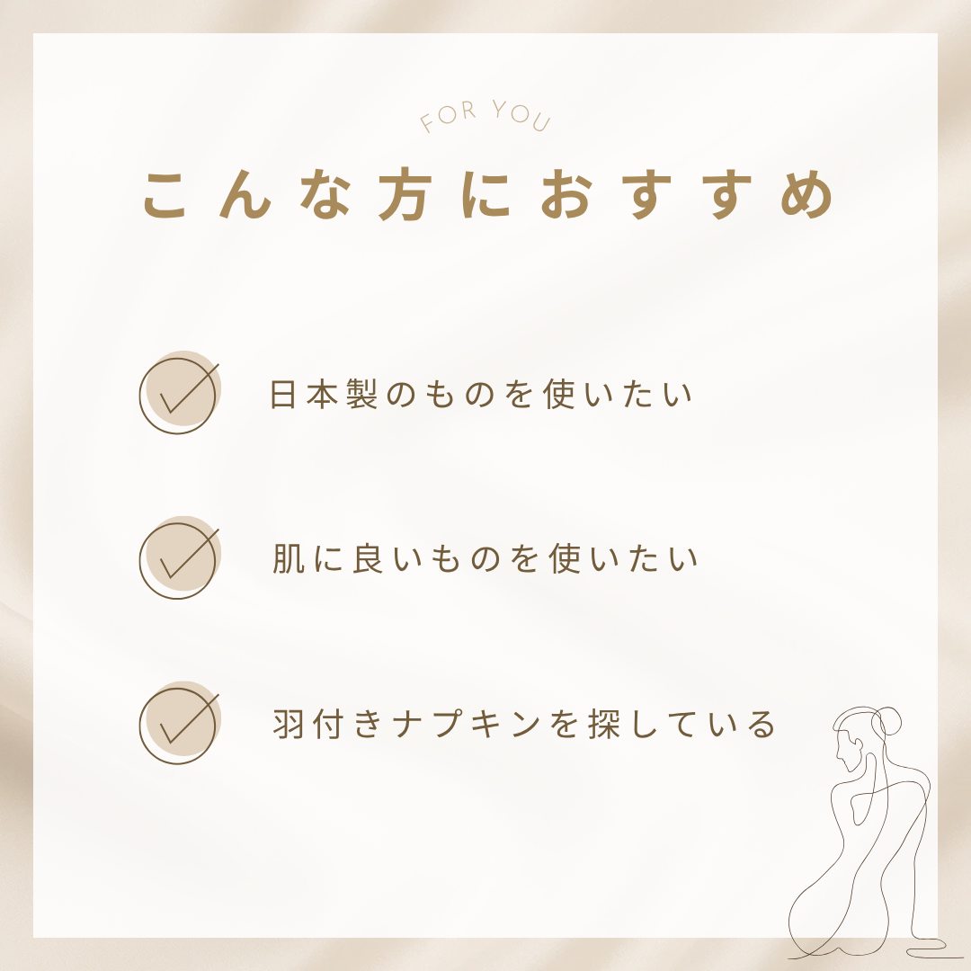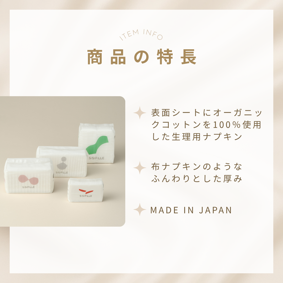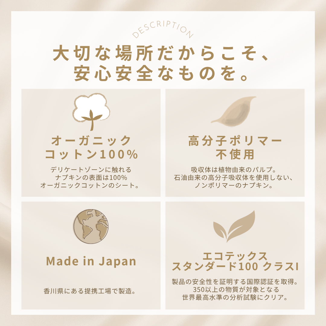 経血をキャッチするための吸収材には植物由来のセルロースパルプのみを使用。薄型ナプキンなどで一般的に使用されている石油由来の吸収性ポリマーを使用していないため、布ナプキンのようなふっくらシックな厚みがあります。 香川県の提携工場で製造している、MADE IN JAPANの商品です。