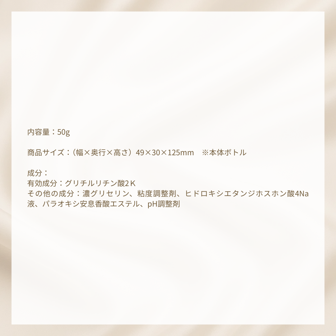 有効成分:グリチルリチン酸2K、その他の成分:濃グリセリン、粘度調整剤、ヒドロキシエタンジホスホン酸4Na液、パラオキシ安息香酸エステル、pH調整剤