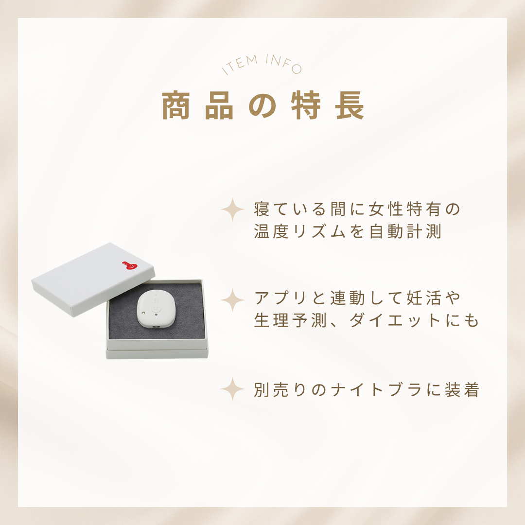 就寝前に専用ナイトブラに装着して寝るだけで、女性特有の温度リズムを自動で計測し、記録することができるデバイスです。