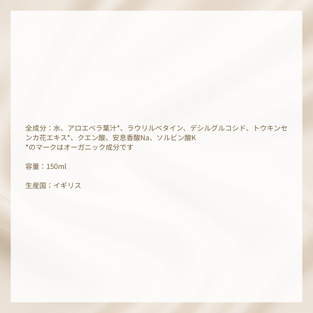 全成分:水、アロエベラ葉汁*、ラウリルベタイン、デシルグルコシド、トウキンセンカ花エキス*、クエン酸、安息香酸Na、ソルビン酸K