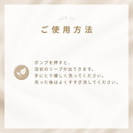 ポンプを押すと、泡状のソープが出てきます。 手にとり優しく洗ってください。洗った後はよくすすぎ流してください。