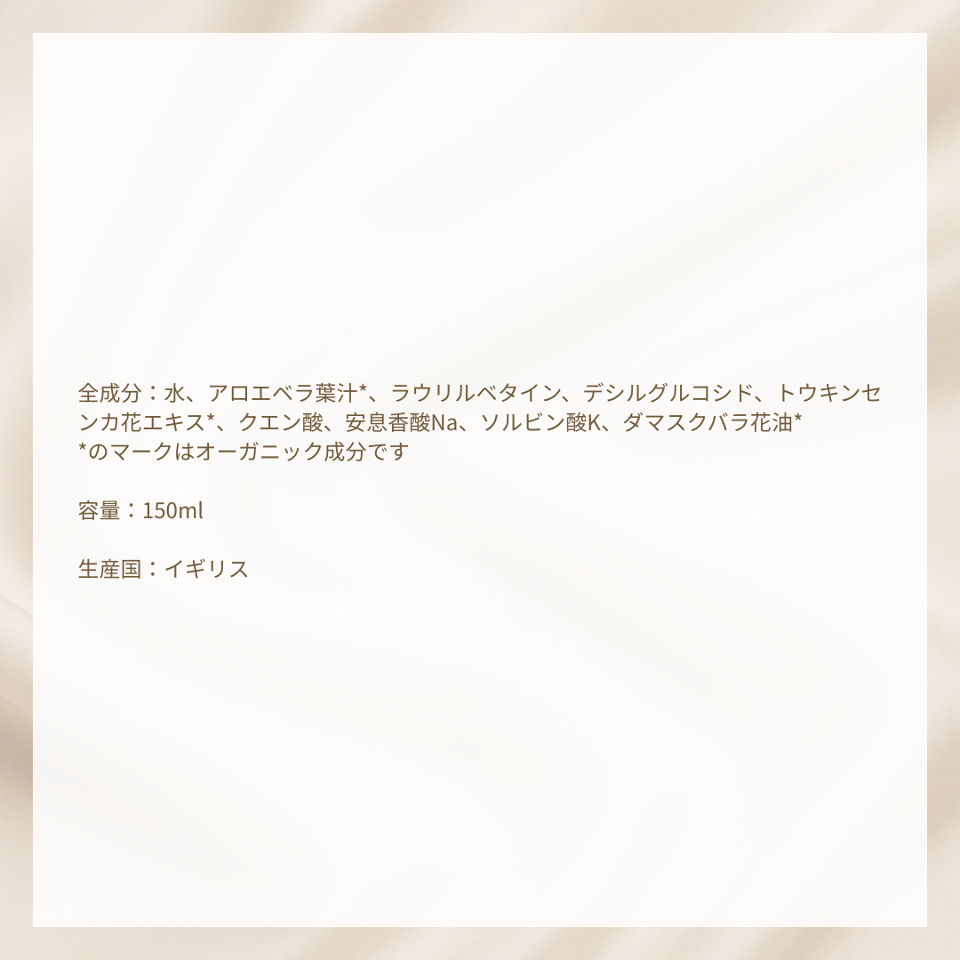 全成分:水、アロエベラ葉汁*、ラウリルベタイン、デシルグルコシド、トウキンセンカ花エキス*、クエン酸、安息香酸Na、ソルビン酸K、ダマスクバラ花油*