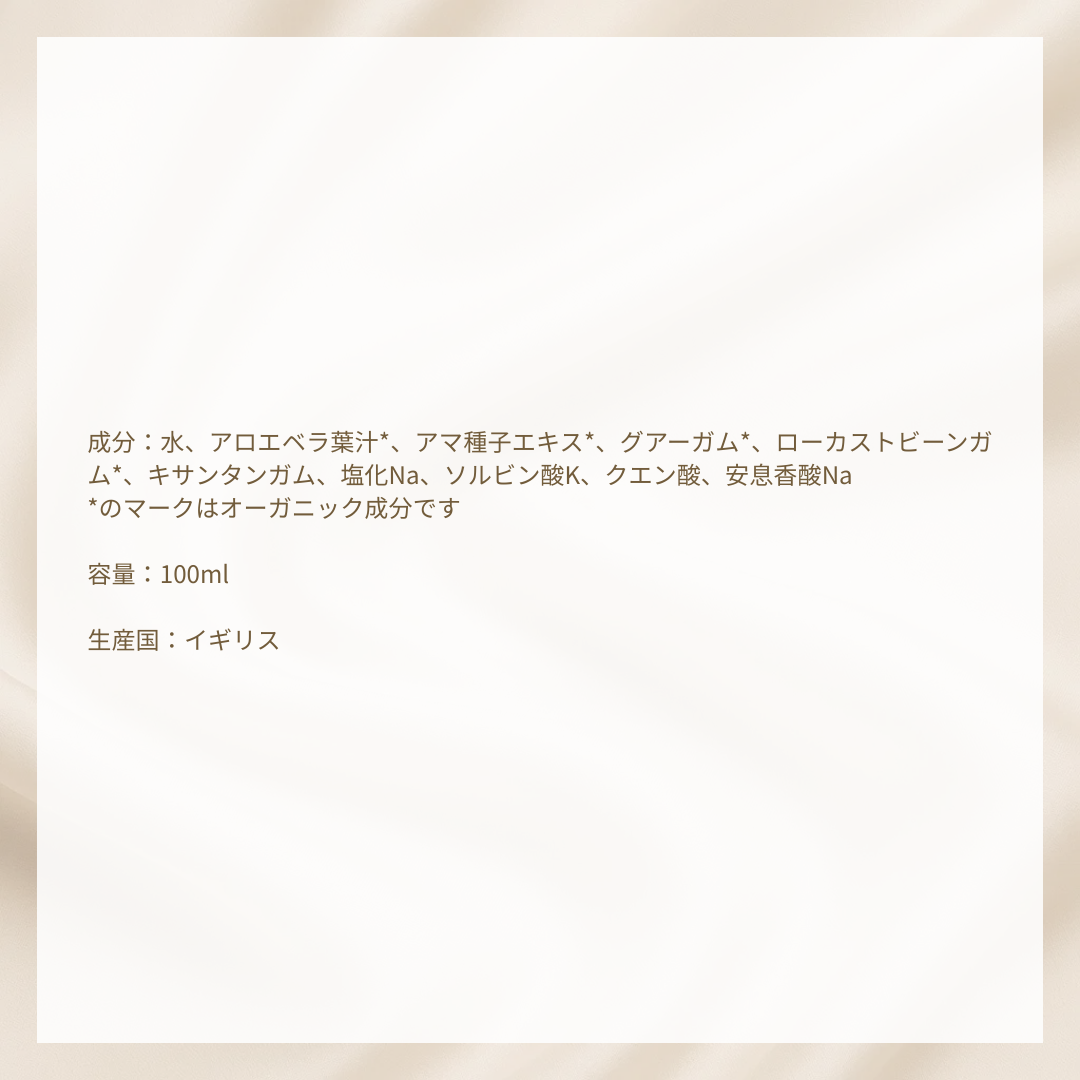 成分:水、アロエベラ葉汁※、アマ種子エキス※、グアーガム※、ローカストビーンガム※、キサンタンガム、塩化Na、ソルビン酸K、クエン酸、安息香酸Na