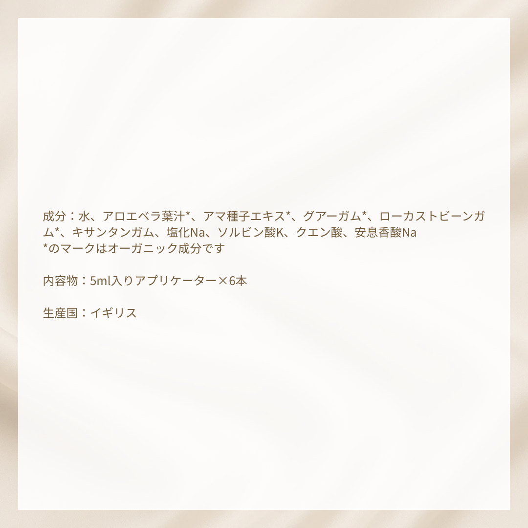 全成分:水、アロエベラエキス*、グアーガム*、イナゴマメ果実エキス*、アマ種子エキス*、キサンタンガム、塩化Na、安息香酸Na、クエン酸、ソルビン酸K